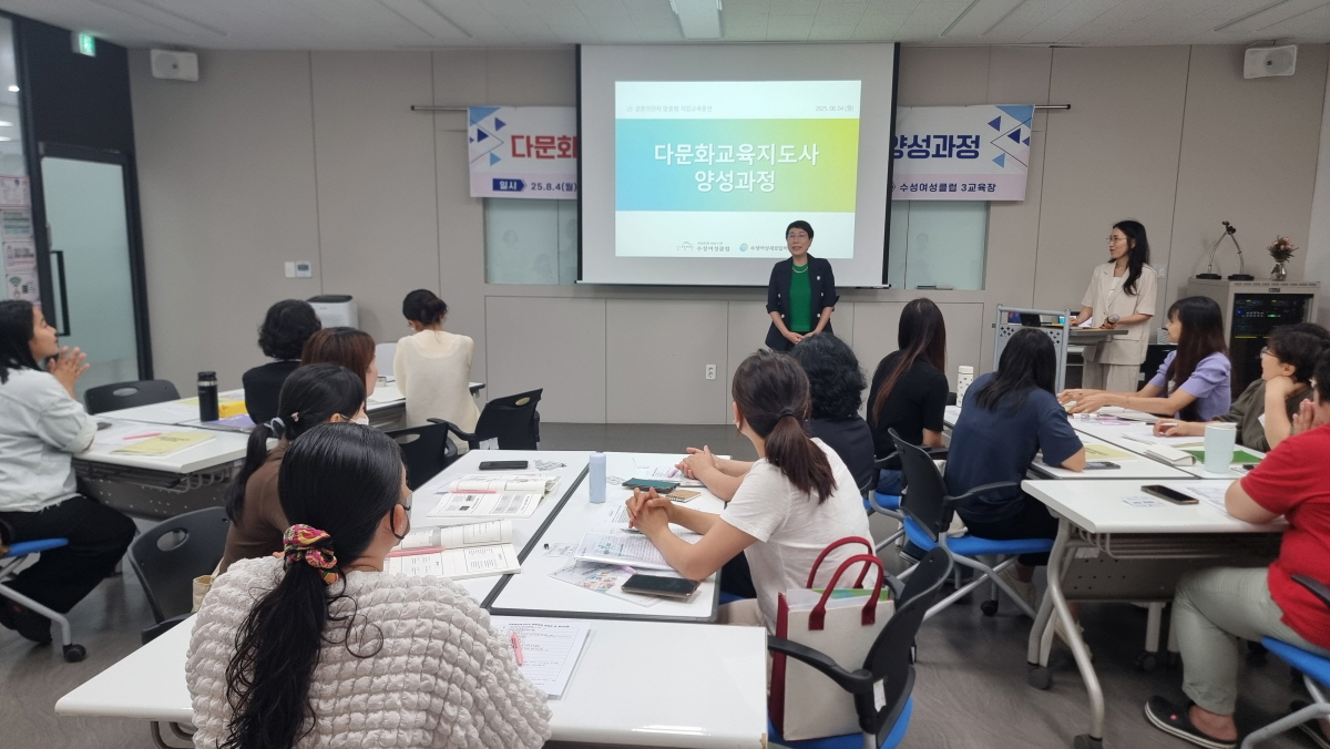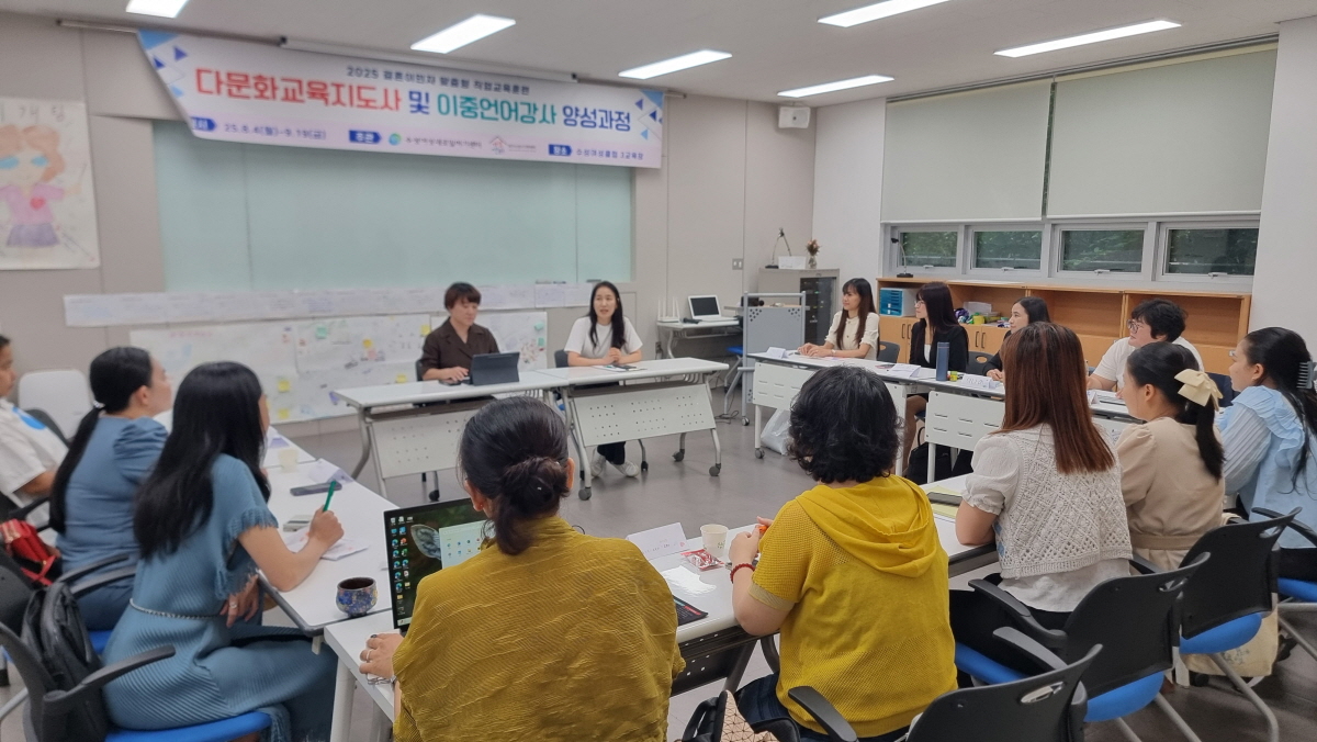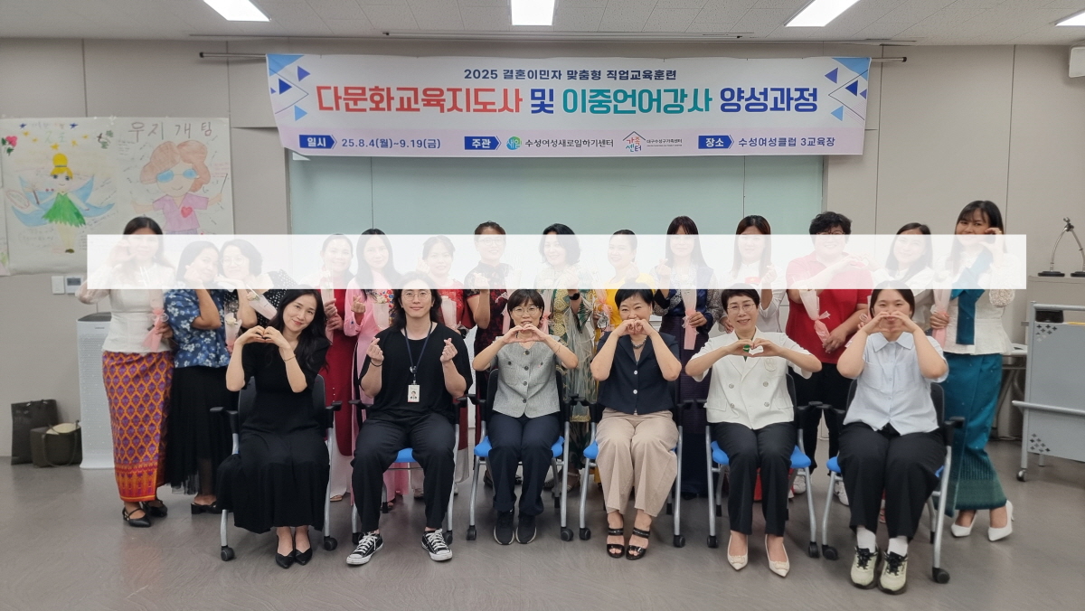 [2025. 8. 25.] (직훈)다문화교육지도사 및 이중언어강사 양성과정 수료식 본문 개강(8월4일)강사간담회(8월22일)수료식(8월25일) 페이스북 공유 트위터 공유 구글+ 공유 목록 이전글[직훈] 일자리협력망 회의 25.08.29 다음글[2025. 8. 1] (주민참여예산) 창업역량강화를 위한 산업도예교육:뚜비활용과정 수료식 25.08.04 댓글목록 댓글목록 등록된 댓글이 없습니다.