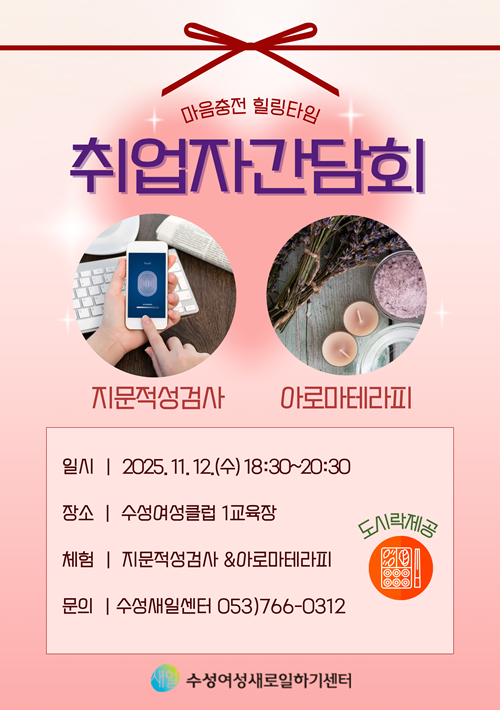 [2025. 11. 12.] 취업자 간담회(경력단절예방사업+사후관리) 본문 .... 페이스북 공유 트위터 공유 구글+ 공유 목록 이전글[2025. 11. 14.]<대구행복상회> 들안아트몰 팝업 스토어 '뚜비와 함께하는 수성구 들안예술마을 공예 아트 마켓> 25.11.18 다음글[2025. 10. 29.] 굿잡카페_2차(동구 반계공원) 25.10.30 댓글목록 댓글목록 등록된 댓글이 없습니다.