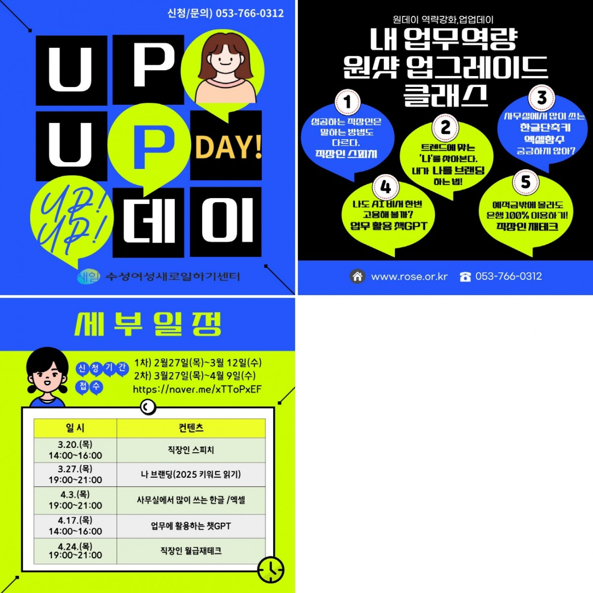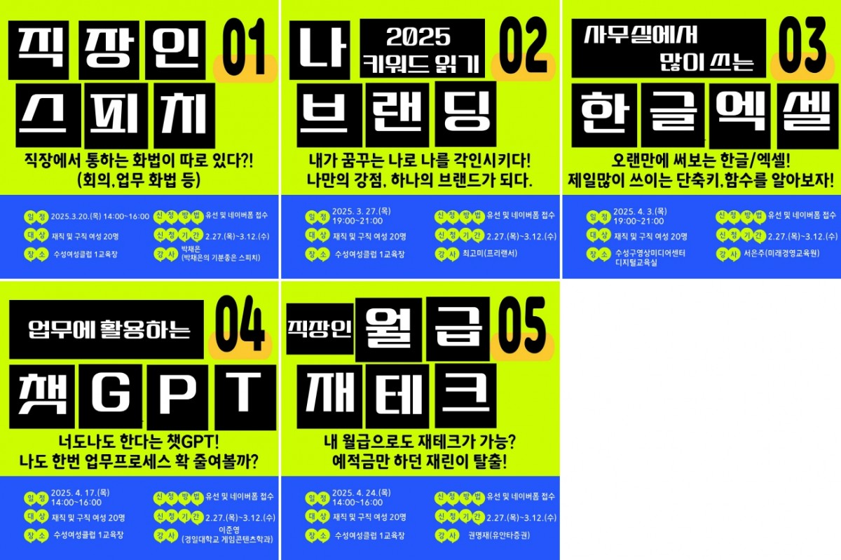 [경력단절예방지원사업] 원데이 역량강화,업업데이 안내 페이지 정보 본문 내 업무역량 원샷 업그레이드 클래스 페이스북 공유 트위터 공유 구글+ 공유 이전글[한국폴리텍대학] AI크리에이터&커머스 창업 무료 교육생 모집:1~3월까지 다음글청소매니져교육안내=>2025. 2. 7.(금)13:00~18:00 (여성구인) 목록 댓글목록 0 댓글목록 등록된 댓글이 없습니다.