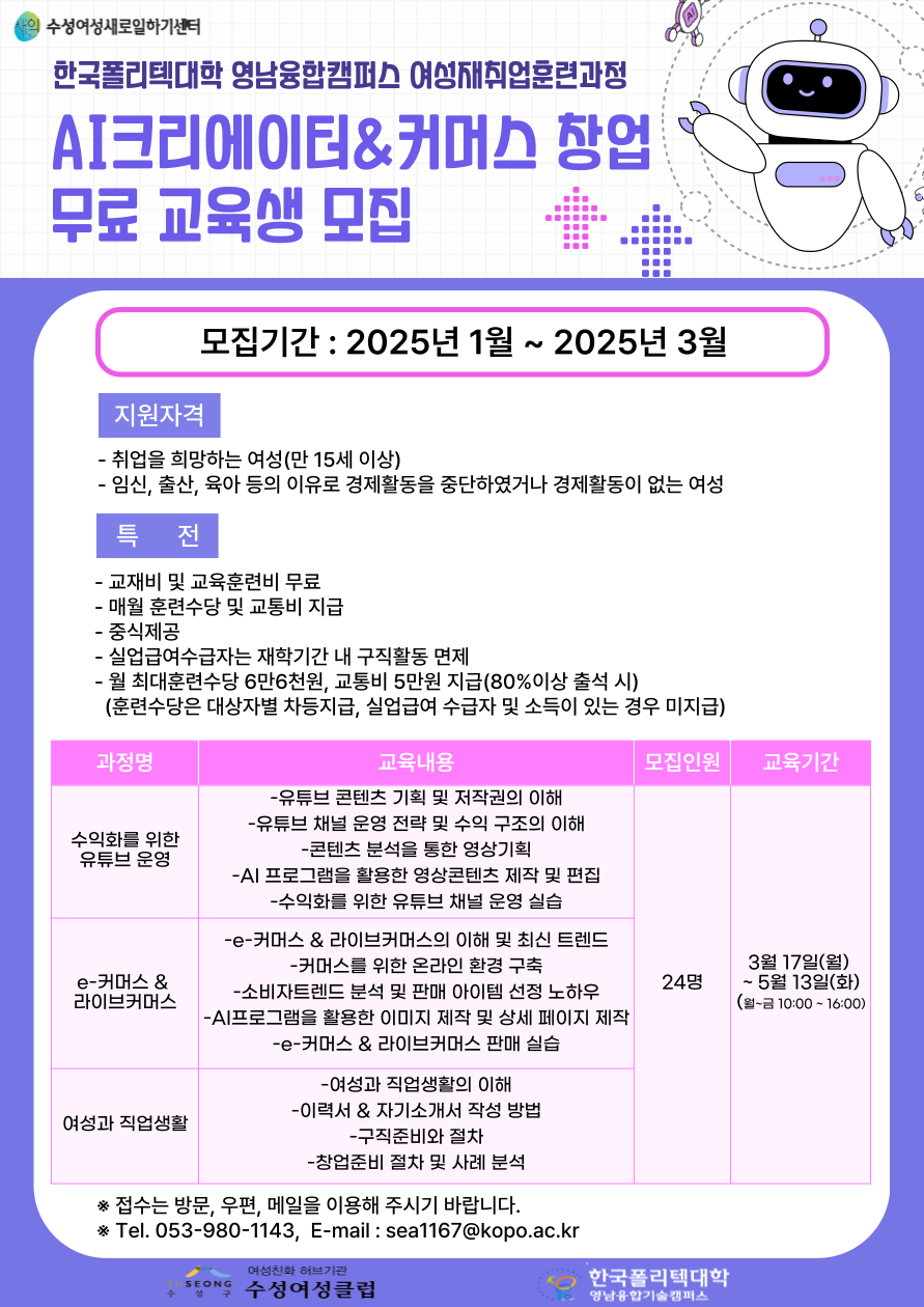 [한국폴리텍대학] AI크리에이터&커머스 창업 무료 교육생 모집:1~3월까지