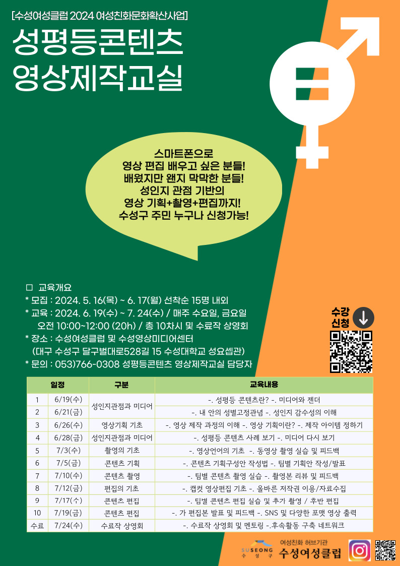 2024년 [성평등 콘텐츠 영상제작교실] 수강생을 모집합니다.
