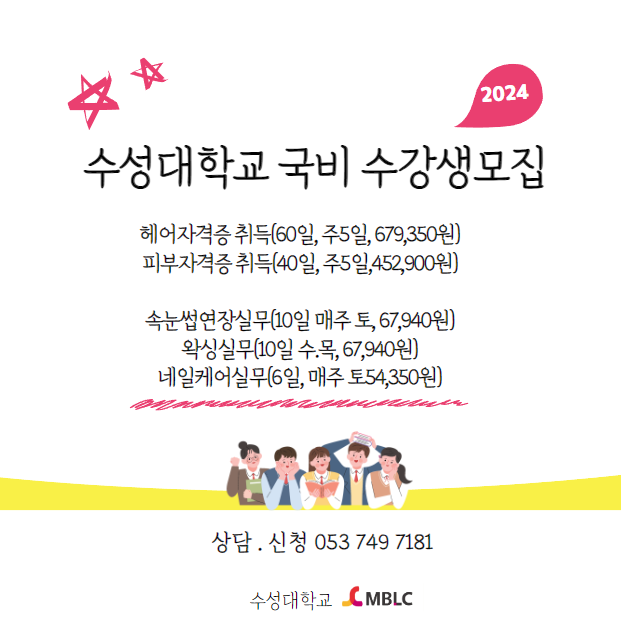 ( 수성대학교 MBLC ) 국비 교육생모집 페이지 정보 본문 수성대학교 MBLC 페이스북 공유 트위터 공유 구글+ 공유 이전글청소매니져교육안내=>2024. 3. 29.(금)13:00~18:00=>마감 다음글[여성가족친화마을조성사업] 2024년 행복수성마을만들기 공모 선정 결과 목록 댓글목록 0 댓글목록 등록된 댓글이 없습니다.