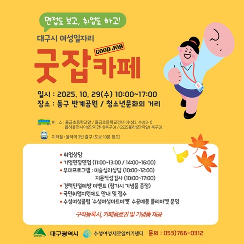 [굿잡카페] 동구 반계공원/청소년문화의 거리 =>10월29일(수) 페이지 정보 본문 여성의 존엄과 가치를 실현하는 수성여성클럽 수성여성새로일하기센터입니다.면접도 보고, 취업도 하고! 대구시여성일자리 굿잡카페 일시 : 10월 29일(수) 10:00~17:00 장소 : 동구 반계공원 / 청소년문화의 거리취업상담부터 현장면접, 심리상담, 지문적성검사까지!하루 동안 취업 준비도 하고 가을날 야외에서 특별한 카페가 열립니다주요 프로그램취업상담기업 현장면접 (11:00~13:00 / 14:00~16:00)부대프로그램 미술심리상담 (10:00~12:00)/ 지문적성검사 (10:00~17:00)‘경력단절예방’ 이벤트 & 기념품 증정 국민취업지원제도 안내 및 접수수성여성클럽 ‘수성여성아트마켓’ 수공예 플리마켓 운영 구직등록 시, 카페 음료권 & 기념품 제공! 율하역 3번 출구 도보 10분 (율금초등학교 건너 / 율하휴먼시아6단지 인근)선선한 가을날, 야외에서 펼쳐지는 구직행사에주변분들과 함께 많이 들러주세요! 문의 : 053-766-0312 (수성여성새로일하기센터)#수성여성새일센터 #굿잡카페 #대구시여성일자리 #여성취업상담 #현장면접 #취업상담 #구직등록 #동구청소년문화의거리 #플리마켓 페이스북 공유 트위터 공유 구글+ 공유 이전글[경력단절예방지원사업] 우리회사 Before&After 환경개선 업체 심사 결과 다음글[수성대학교] 글로컬마케터리더 양성과정&웹소설IP창작자 양성과정 교육생 모집 목록 댓글목록 0 댓글목록 등록된 댓글이 없습니다.